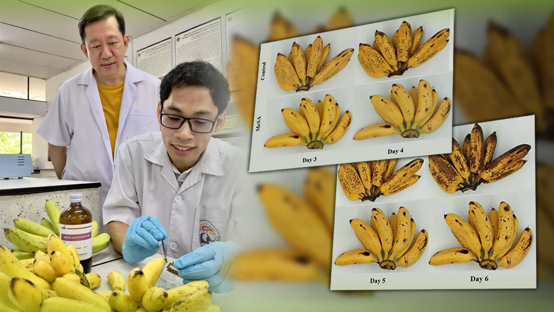มหาวิทยาลัยเชียงใหม่ โดยทีมนักวิจัยสรีรวิทยาวิทยาและอณูชีววิทยาของพืช ภาควิชาชีววิทยา คณะวิทยาศาสตร์ คิดค้นวิธีการลดและชะลอการตกกระของผลกล้วยไข่ด้วยเมทิลซาลิไซเลต ผ่านการควบคุมการตายของเซลล์อย่างเป็นระบบ (Programmed cell death)