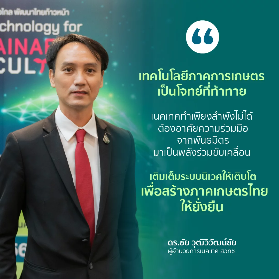ดร.ชัย วุฒิวิวัฒน์ชัย ผู้อำนวยการเนคเทค สวทช. กล่าวว่า เนคเทค สวทช. ให้ความสำคัญและมีความพยายามดำเนินงานผลักดันงานวิจัย/เทคโนโลยีเพื่อภาคการเกษตร มากว่า 10 ปี และยังเป็นหนึ่งใน 8 กลยุทธ์การดำเนินงานแบบมุ่งเป้าที่กำหนดไว้ในปัจจุบันนั่นคือ ระบบเกษตรแม่นยำ(Precision Farming)กับโจทย์หลัก คือ “เราจะนำเทคโนโลยีมาช่วยทำการเกษตรให้เกิดประสิทธิภาพสูงอย่างไร” ซึ่งต้องยอมรับว่าเป็นโจทย์ที่ท้าทาย และเนคเทคไม่สามารถทำให้ประสบความสำเร็จได้เพียงลำพังอย่างแน่นอน ต้องอาศัยความร่วมมือจากหน่วยงานพันธมิตรทั้งภาครัฐ และภาคเอกชนที่ท่านมีภารกิจหลักในการสนับสนุนส่งเสริมภาคเกษตรกรรมภายในประเทศ มีความพร้อมทางด้านเทคโนโลยี แหล่งทุนสนับสนุน และโครงสร้างพื้นฐานต่าง ๆ มาเป็นพลังร่วมขับเคลื่อนที่สำคัญที่จะสร้างและเติมเต็มให้เกิดระบบนิเวศ (Ecosystem) ให้เติบโต เพื่อสร้างภาคเกษตรไทยให้ยั่งยืน