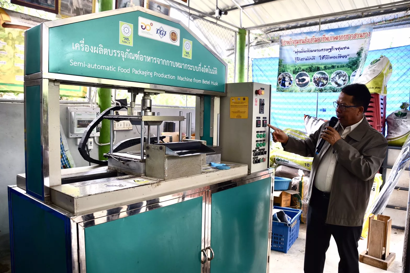 นายธเนศ ศรีรุ่งเรือง นายกองค์การบริหารส่วนตำบลท่าอุแท กล่าวว่า รู้สึกยินดีเป็นอย่างยิ่งที่ วช. นำเครื่องผลิตบรรจุภัณฑ์อาหารจากกาบหมากระบบกึ่งอัตโนมัติ มามอบให้ ทำให้กลุ่มวิสาหกิจชุมชนส่งเสริมอาชีพเกษตรกรชาวสวนยางมีอาชีพ มีรายได้เพิ่มขึ้น นอกจากการปลูกสวนยาง ปาล์มน้ำมัน และทุเรียน ด้วย
