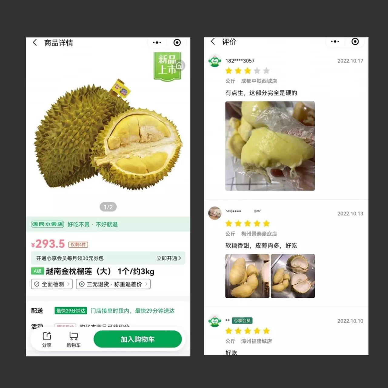 ในวันนี้บนแอพพลิเคชั่น มีทุเรียนแช่แข็งของไทยและทุเรียนสดจากเวียดนามมาจำหน่าย เลยลองสั่งทุเรียนเวียดนามมาทดสอบรสชาติและพบข้อมูลดังนี้