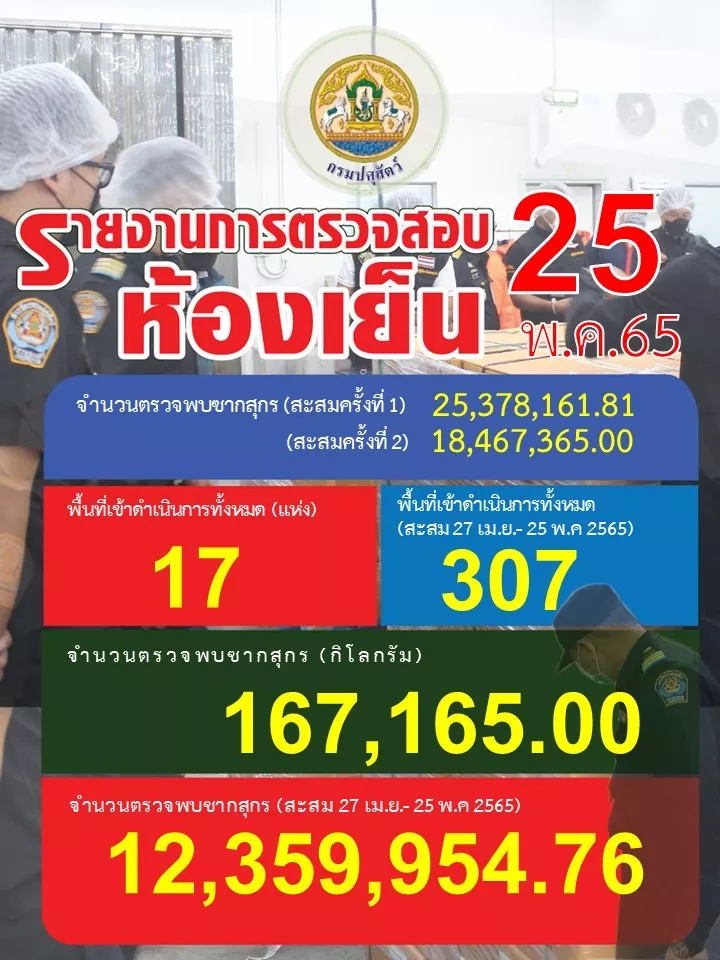 รายงานผลการตรวจสอบห้องเย็นประจำวันที่ 25 พฤษภาคม 2565 พื้นที่ที่เข้าตรวจสอบรอบใหม่รอบที่ 3 จำนวน 17 แห่ง ในจังหวัด ลำปาง สงขลา เชียงใหม่ ระยอง และจันทบุรี ตรวจพบซากสุกรจำนวน167,165.00 กิโลกรัม รวมจำนวนตรวจพบซากสุกรที่พบในห้องเย็นรอบใหม่ (รอบที่ 3) รวมสะสมตั้งแต่27 เมษายน – 25 พฤษภาคม 2565 รวมทั้งสิ้น 12,359,954.76 กิโลกรัม จากห้องเย็นรอบสามทั้งหมด307 แห่ง (รอบแรกผลการตรวจสอบซากสุกรสะสมตั้งแต่วันที่ 20 มกราคม – 24 กุมภาพันธ์ 2565 พบซากสุกรจำนวน 25,378,161.810 กิโลกรัม รอบสองตั้งแต่วันที่ 25 กุมภาพันธ์ – 26 เมษายน 2565 พบซากสุกรจำนวน 18,467,365.00 กิโลกรัม)