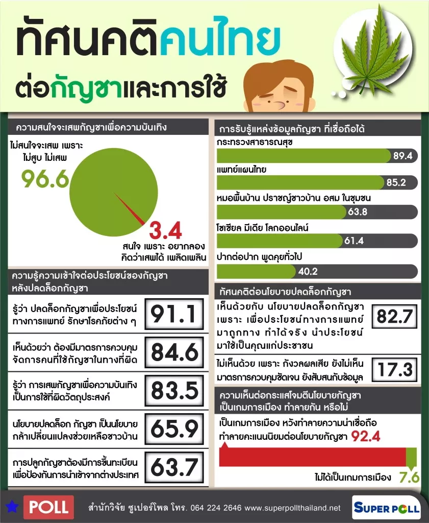 17 กรกฎาคม 2565 ผู้ช่วยศาสตราจารย์ ดร.นพดล กรรณิกา ผู้อำนวยการสำนักวิจัยซูเปอร์โพล (SUPER POLL) เสนอผลสำรวจ เรื่อง ทัศนคติคนไทยต่อกัญชาและการใช้กรณีศึกษาประชาชนทุกสาขาอาชีพทั่วประเทศโดยดำเนินโครงการทั้งการวิจัยเชิงปริมาณ (Quantitative Research) และการวิจัยเชิงคุณภาพ (Qualitative Research) จำนวน 2,125 ตัวอย่าง ระหว่างวันที่ 13- 6 กรกฎาคม พ.ศ. 2565 ที่ผ่านมา