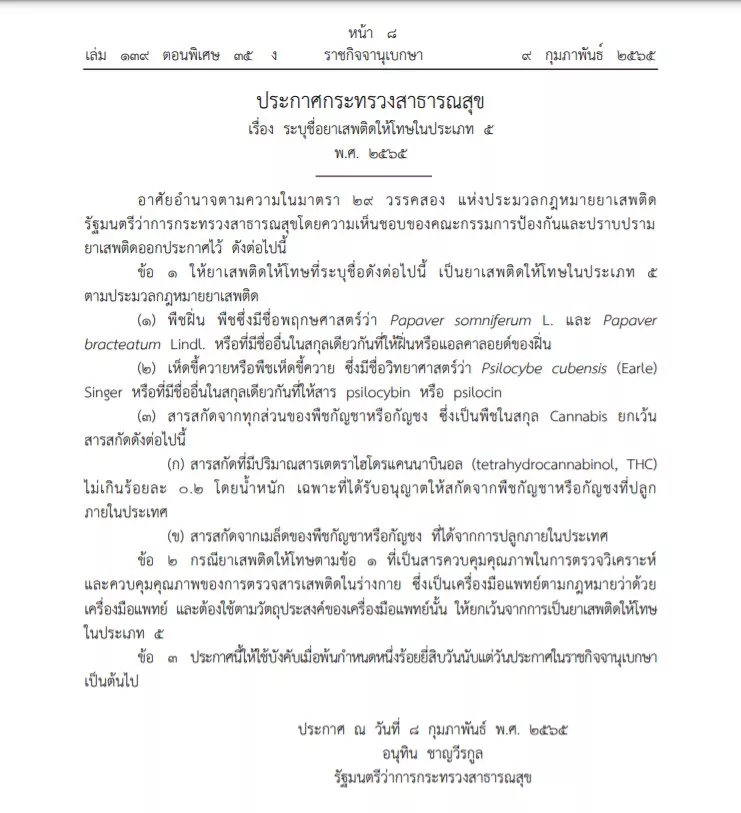 ทั้งนี้เพื่อขอให้ศาลปกครองกลางมีคําพิพากษาให้เพิกถอนประกาศกระทรวงสาธารณสุข ลงวันที่ 8 ก.พ.2565 เรื่อง ระบุชื่อยาเสพติดให้โทษในประเภท 5 พ.ศ. 2565 โดยให้มีผลย้อนหลังไปถึงวันที่มีการออกประกาศฉบับดังกล่าว และให้กัญชาจัดเป็นยาเสพติดให้โทษประเภทที่ 5 ตามประกาศกระทรวงสาธารณสุข ลงวันที่ 8 ธ.ค2563 เรื่อง ระบุชื่อยาเสพติดให้โทษในประเภทที่ 5 พ.ศ. 2563 ดังเดิม พร้อมทั้งขอให้ศาลมีคําสั่งคุ้มครองชั่วคราว ด้วยการทุเลาการบังคับ ตามประกาศกระทรวงสาธารณสุขดังกล่าว ไว้เป็นการชั่วคราวก่อนการพิพากษาคดีด้วย
