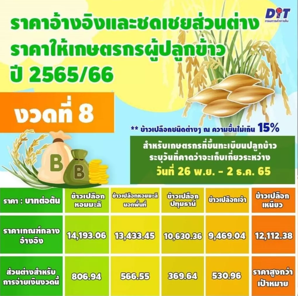 โดยเกษตรกรจะได้รับเงินส่วนต่างสำหรับงวดที่ 8 สูงสุด ดังนี้ ข้าวเปลือกหอมมะลิ 11,297.16 บาท ข้าวเปลือกหอมมะลินอกพื้นที่ 9,064.80 บาท ข้าวเปลือกปทุมธานี 9,241 บาท และข้าวเปลือกเจ้า 15,928.80 บาท