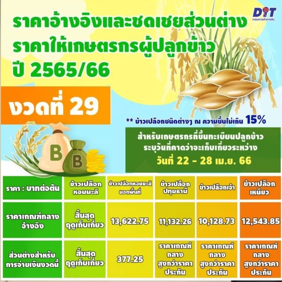 นายอุดม ศรีสมทรง รองอธิบดีกรมการค้าภายใน เปิดเผยว่า คณะอนุกรรมการกำกับดูแลและกำหนดเกณฑ์กลางอ้างอิงโครงการประกันรายได้เกษตรกรผู้ปลูกข้าว ได้พิจารณาราคาเกณฑ์กลางอ้างอิงและการชดเชยส่วนต่างราคาตามโครงการประกันรายได้เกษตรกรผู้ปลูกข้าวปี 2565/66 งวดที่ 29 สำหรับเกษตรกรที่แจ้งวันที่คาดว่าจะเก็บเกี่ยวระหว่างวันที่ 22-28 เม.ย.2566 โดยมีการจ่ายเงินส่วนต่างให้กับเกษตรกรผู้ปลูกข้าวจำนวน ชนิด ได้แก่ ข้าวเปลือกหอมมะลินอกพื้นที่ ส่วนข้าวเปลือกหอมปทุมธานี ข้าวเปลือกเจ้า และข้าวเปลือกเหนียว ไม่ต้องจ่าย เพราะราคาสูงกว่าเป้าหมาย และข้าวเปลือกหอมมะลิ ไม่มีราคาเกณฑ์กลางอ้างอิง เนื่องจากสิ้นสุดฤดูเก็บเกี่ยวแล้ว