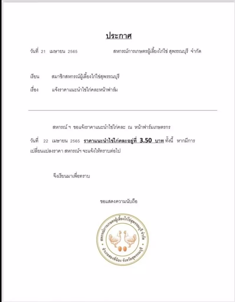 อาทิ สหกรณ์ผู้เลี้ยงไก่ไข่แปดริ้ว จำกัด ประกาศ “ราคาไข่ไก่คละ” 3.50 บาทต่อฟองที่น้ำหนัก 20.5 กิโลกรัม ตั้งแต่วันพรุ่งนี้เป็นต้นไป เช่นเดียวกับ สหกรณ์ผู้เลี้ยงไก่ไข่ชลบุรี จำกัด,สหกรณ์การเกษตรผู้เลี้ยงไก่ไข่สุพรรณบุรี จำกัด ที่ประกาศ “ราคาไข่ไก่คละ” 3.50 บาทต่อฟอง