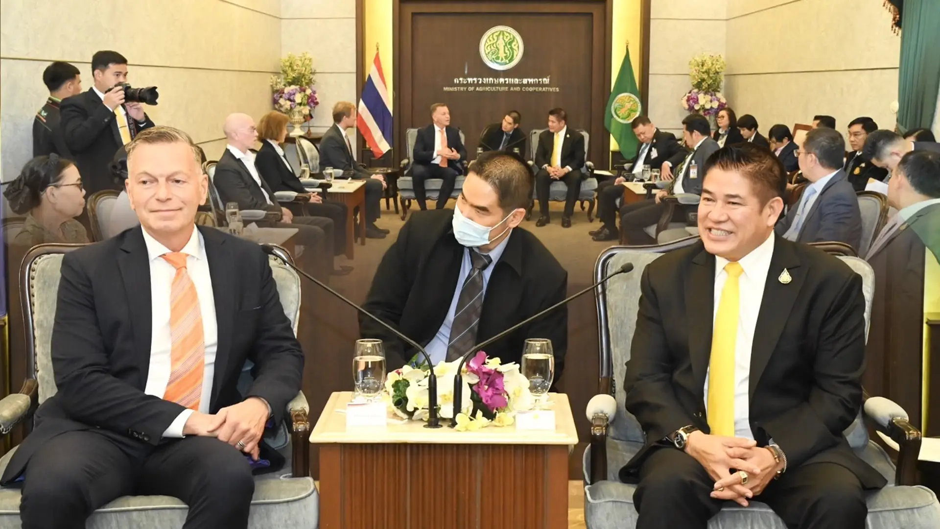 ร้อยเอก ธรรมนัส พรหมเผ่า รัฐมนตรีว่าการกระทรวงเกษตรและสหกรณ์ หารือร่วมกับนายฮานส์ อูลริช ซูดเบค อุปทูตและหัวหน้าแผนกเศรษฐกิจของสถานทูตเยอรมันประจำกรุงเทพฯ และนายไรน์โฮลด์ เอลเกส ผู้อำนวยการองค์กรความร่วมมือระหว่างประเทศเยอรมันประจำประเทศไทย (GIZ) โดยมีนายประยูร อินสกุล ปลัดกระทรวงเกษตรและสหกรณ์ ดร. บุรินทร์ สุขพิศาล คณะที่ปรึกษารัฐมนตรีว่าการกระทรวงเกษตรและสหกรณ์ นางสาวเบญจพร ชาครานนท์ คณะที่ปรึกษารัฐมนตรีว่าการกระทรวงเกษตรและสหกรณ์ นายพีรพันธ์ คอทอง อธิบดีกรมส่งเสริมการเกษตร นายฉันทานนท์ วรรณเขจร เลขาธิการสำนักงานเศรษฐกิจการเกษตร นางสาวนฤมล สงวนวงศ์ ผู้ช่วยปลัดกระทรวงเกษตรและสหกรณ์ นายอานนท์ นนทรีย์ รองอธิบดีกรมการข้าว นายอาทิตย์ ศุขเกษม รองอธิบดีกรมพัฒนาที่ดิน ผู้อำนวยการสำนักแผนงานและโครงการพิเศษ และสำนักการเกษตรต่างประเทศ เข้าร่วม ณ ห้องประชุมกระทรวงเกษตรและสหกรณ์