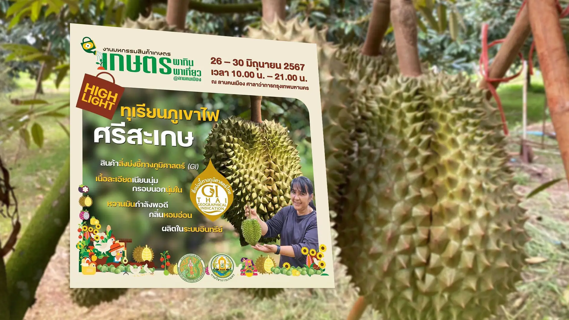 ป้ายโปรโมทงานเชิญชวนให้คนไปร่วมงาน งานมหกรรมสินค้าเกษตร เกษตรพาเที่ยว พากิน @ลานคนเมือง 26 – 30 มิถุนายน 2567 เวลา 10.00 น. – 21.00 น. ณ ลานคนเมือง ศาลาว่าการกรุงเทพมหานคร ทุเรียนภูเขาไฟศรีสะเกษ สินค้าสิ่งบ่งชี้ทางภูมิศาสตร์ (GI) เนื้อละเอียดเนียนนุ่ม กรอบนอกนุ่มใน สิ่งบ่งชี้ทางภูมิศาสตร์ไทย หวานมันกำลังพอดี กลิ่นหอมอ่อน ผลิตในระบบอินทรีย์