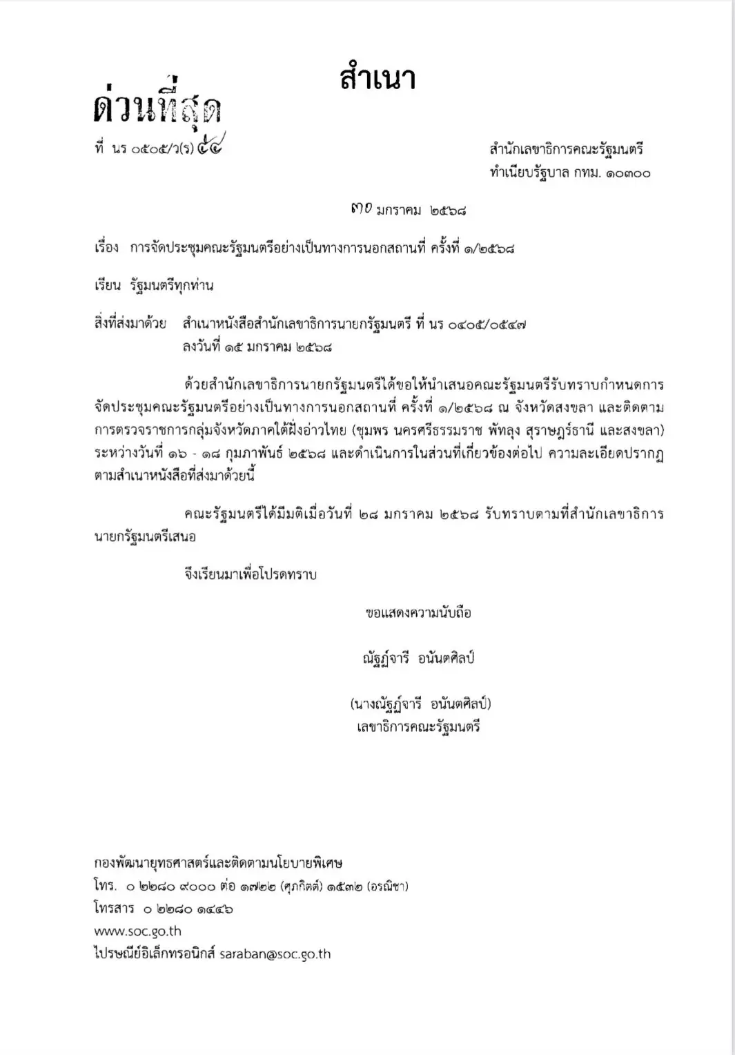 คณะรัฐมนตรีมีมติเห็นชอบการจัดประชุมคณะรัฐมนตรีอย่างเป็นทางการนอกสถานที่ ครั้งที่ 1/2568 โดยนายกรัฐมนตรีได้เห็นชอบกำหนดการจัดประชุมคณะรัฐมนตรีอย่างเป็นทางการนอกสถานที่ ครั้งที่ 1/2568 ณจังหวัดสงขลา ในวันอังคารที่ 18 กุมภาพันธ์ 2568 และติดตามการตรวจราชการกลุ่มจังหวัดภาคใต้ฝั่งอ่าวไทย (จังหวัดชุมพร นครศรีธรรมราช พัทลุง สุราษฎร์ธานี และสงขลา) ระหว่างวันอาทิตย์ที่ 16 – วันอังคารที่ 18 กุมภาพันธ์ 2568