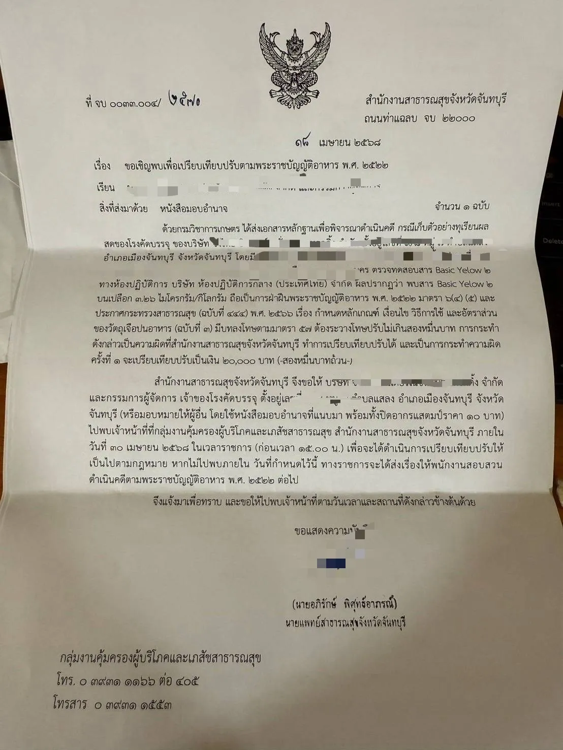 สำนักงานสาธารณสุขจังหวัดจันทบุรี จึงขอให้ กรรมการผู้จัดการ เจ้าของโรงคัดบรรจุดังกล่าว หรือผู้ได้รับมอบหมาย ไปพบเจ้าหน้าที่ที่กลุ่มงานคุ้มครองผู้บริโภคและเภสัชสาธารณสุข สำนักงานสาธารณสุขจังหวัดจันทบุรี ภายในวันที่ 30 เมษายน 2568 ในเวลาราชการ (ก่อนเวลา 15.00 น.) เพื่อจะได้ดำเนินการเปรียบเทียบปรับให้เป็นไปตามกฎหมาย หากไม่ไปพบภายใน วันที่กำหนดไว้นี้ ทางราชการจะได้ส่งเรื่องให้พนักงานสอบสวนดำเนินคดีตามพระราชบัญญัติอาหาร พ.ศ.2522 ต่อไป