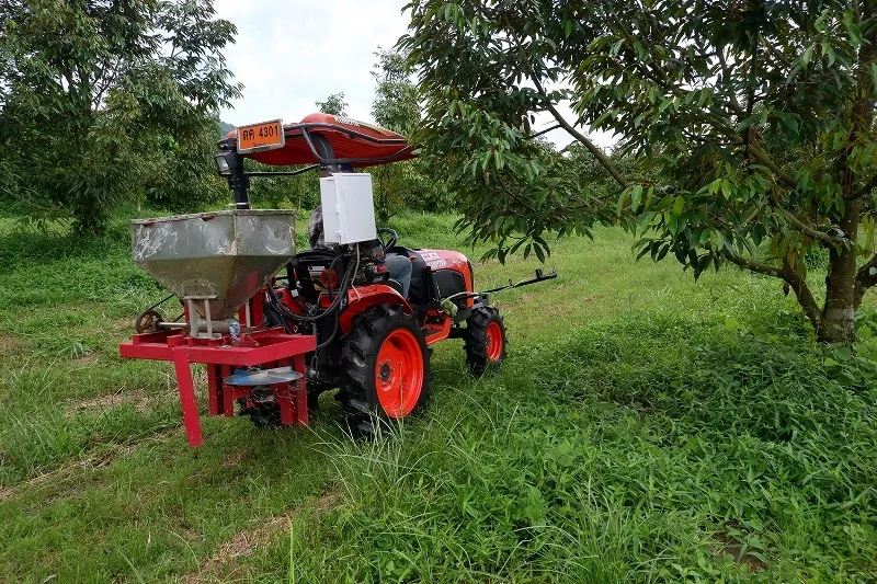 คณะนักวิจัยศูนย์วิจัยเกษตรวิศวกรรมจันทบุรี สถาบันวิจัยเกษตรวิศวกรรม จึงได้คิดค้นนำเทคโนโลยีมาพัฒนาเครื่องใส่ปุ๋ยแบบแม่นยำ โดยใช้รถแทรกเตอร์ขนาด 27 แรงม้าเป็นต้นกำลัง เพื่อใช้งานใส่ปุ๋ยในสวนทุเรียนที่มีระยะปลูกเหมาะสมกับการใช้เครื่องจักรกลเกษตร เป็นต้นแบบที่ใช้ไมโครคอลโทลเลอร์ควบคุมการทำงานของชุดใส่ปุ๋ยแบบจานเหวี่ยง และใช้เซนเซอร์แบบอัลตร้าโซนิค ควบคุมตำแหน่งที่ต้องการใส่ปุ๋ย
