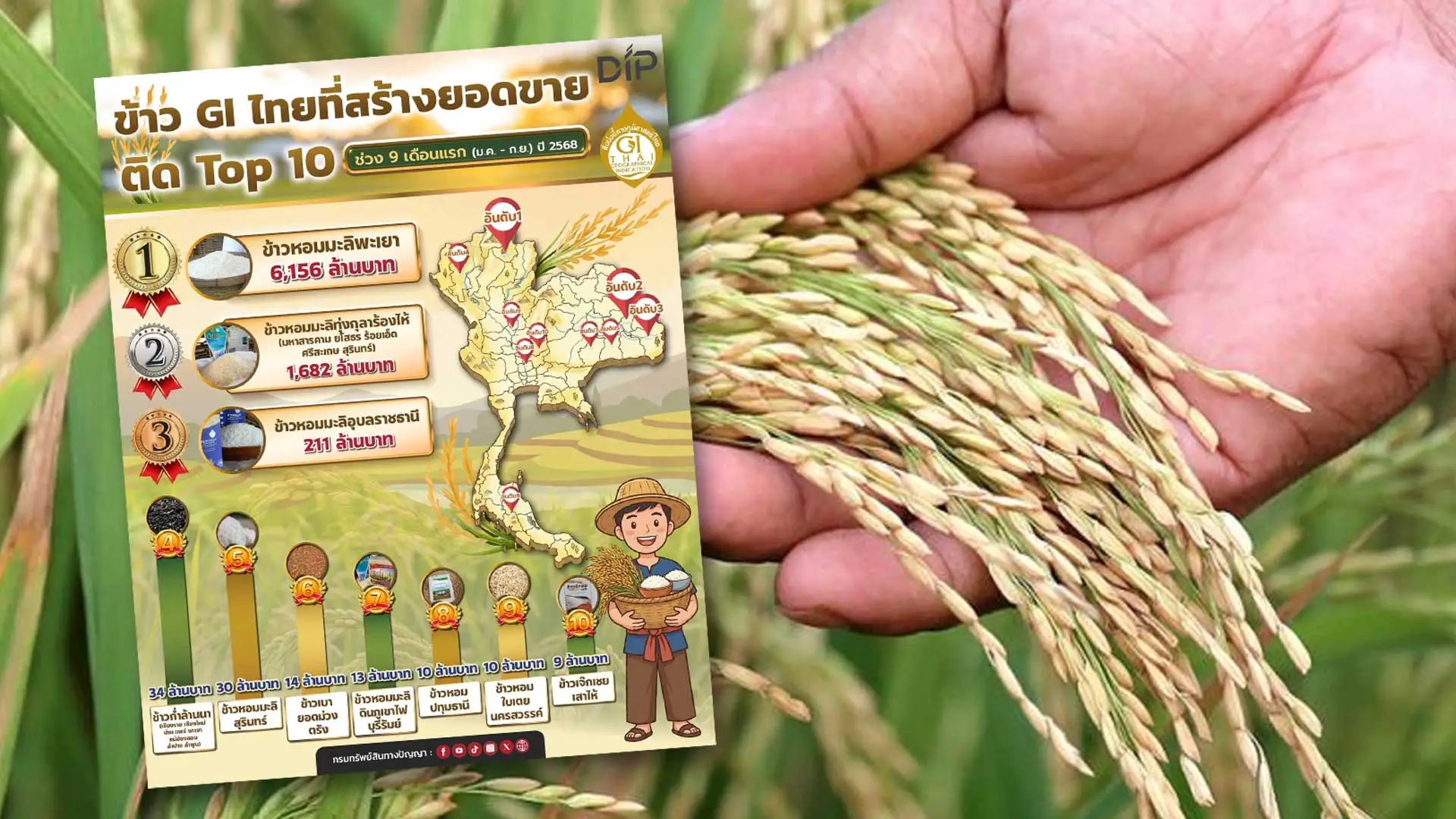 นางอรมน ทรัพย์ทวีธรรม อธิบดีกรมทรัพย์สินทางปัญญา เปิดเผยว่า สินค้าไทยที่ได้รับการขึ้นทะเบียนสิ่งบ่งชี้ทางภูมิศาสตร์จากกรมทรัพย์สินทางปัญญา ล้วนเป็นสินค้าคุณภาพที่มีเอกลักษณ์พิเศษเชื่อมโยงกับแหล่งผลิต ภูมิประเทศ ภูมิอากาศ และภูมิปัญญาท้องถิ่น ด้วยอัตลักษณ์โดดเด่นแตกต่างจากสินค้าทั่วไป ทำให้สินค้า GI เป็นที่ยอมรับของผู้บริโภคและมีมูลค่าเชิงเศรษฐกิจสูง โดยเฉพาะสินค้า “ข้าว” ที่ไม่ได้เป็นเพียงสินค้าบริโภคหลักของคนไทยเท่านั้น แต่ยังเป็นสินค้าส่งออกสำคัญในตลาดโลก โดยนับตั้งแต่ปี 2547 ที่เริ่มมีกฎหมายสิ่งบ่งชี้ทางภูมิศาสตร์ในประเทศไทย กรมทรัพย์สินทางปัญญาได้ขึ้นทะเบียน GI ข้าวไทยไปแล้วทั้งสิ้น 24 รายการ (คิดเป็น 10% ของจำนวนสินค้า GI ไทยทั้งหมด) ซึ่งในช่วง 3 ไตรมาสแรกของปี 2568 สามารถทำรายได้รวมกว่า 8,190 ล้านบาท โดยข้าวไทย GI ที่สร้างมูลค่าสูงสุด 10 อันดับแรก ได้แก่