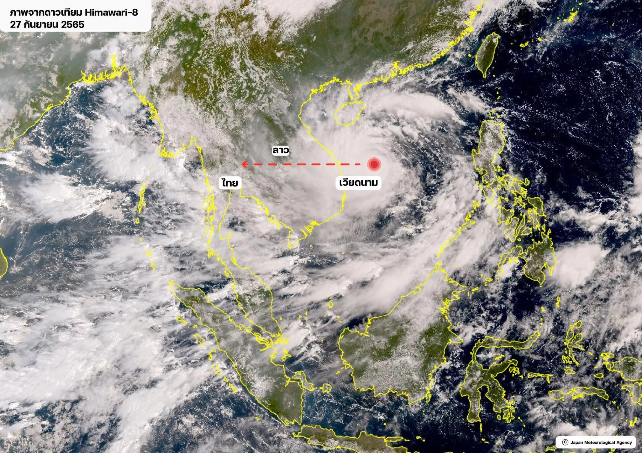 ภาพพายุโนรู ที่กำลังเคลื่อนตัวจากตอนกลางของทะเลจีนใต้ มีทิศทางเคลื่อนที่กำลังจะขึ้นฝั่งเวียดนามด้วยความเร็วลมประมาณ 80 – 100 กิโลเมตรต่อชั่วโมง ซึ่งความเร็วลมอ่อนลงกว่าวานนี้ และกำลังเคลื่อนขึ้นฝั่งประเทศเวียดนามในช่วงสายของวันนี้ จากนั้นจะเคลื่อนผ่านประเทศลาว เข้าสู่ประเทศไทยประมาณวันที่ 28-29 กันยายน 65 บริเวณภาคตะวันออกเฉียงเหนือ และจะส่งผลให้หลายพื้นที่ของประเทศไทย มีฝนตกมาก