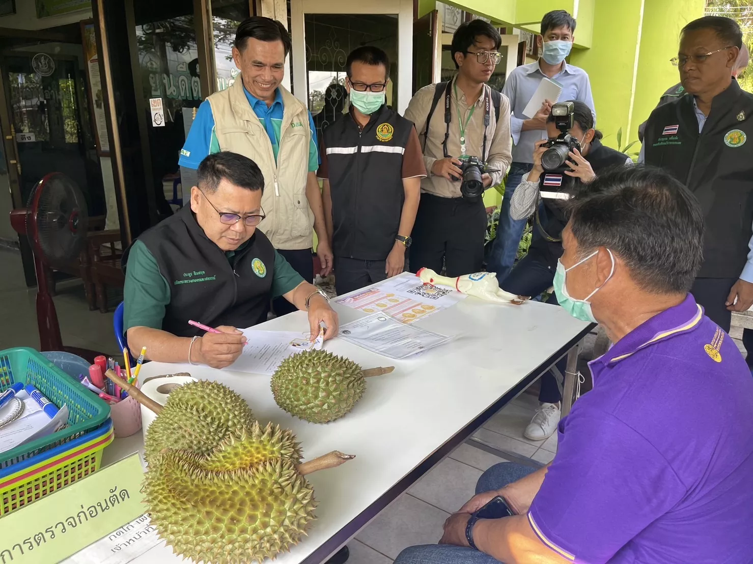 ปลัดกระทรวงเกษตรฯ ยังได้ร่วมสังเกตการณ์ ขณะที่มีเกษตรกร นำทุเรียนไปตรวจวัดเปอร์เซ็นต์น้ำหนักแห้งในเนื้อทุเรียนหลากหลายสายพันธุ์ และยังได้เป็นผู้รับลงทะเบียนก่อนตรวจวัดเปอร์เซ็นต์น้ำหนักแห้ง พร้อมทั้งนำทุเรียนไปผ่าและหั่นเพื่อทำการตรวจตามตามขั้นตอนด้วยตัวเองอีกด้วย
