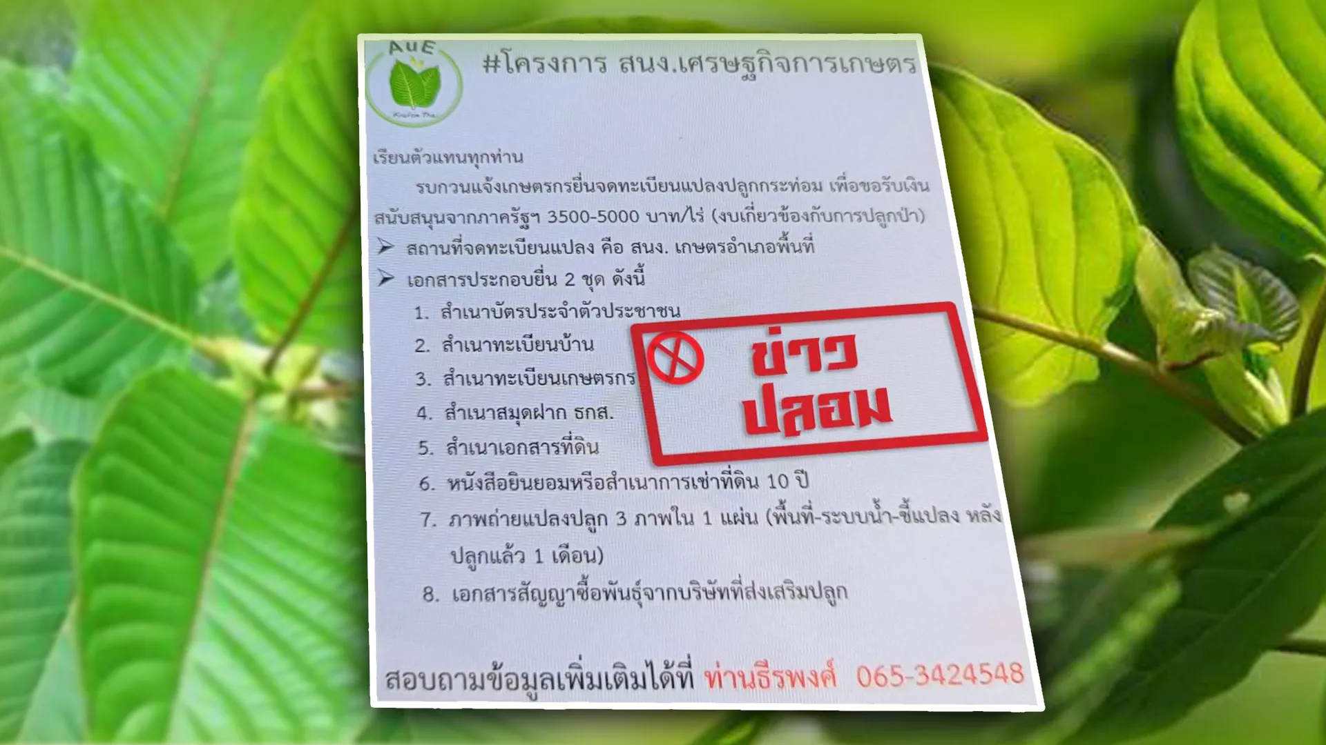 ตามที่ได้มีการเผยพร่สื่อประชาสัมพันธ์ อ้างถึง “โครงการ สนง.เศรษฐกิจการเกษตร” โดยแจ้งให้เกษตรกรยื่นจดทะเบียนแปลงปลูกกระท่อม เพื่อขอรับเงินสนับสนุนจากภาครัฐ 3,500 – 5,000 บาท (งบเกี่ยวข้องกับการปลูกป่า) และให้สอบถามข้อมูลเพิ่มเติมได้ที่ ท่านธีรพงศ์ 065 342 4548 นั้น