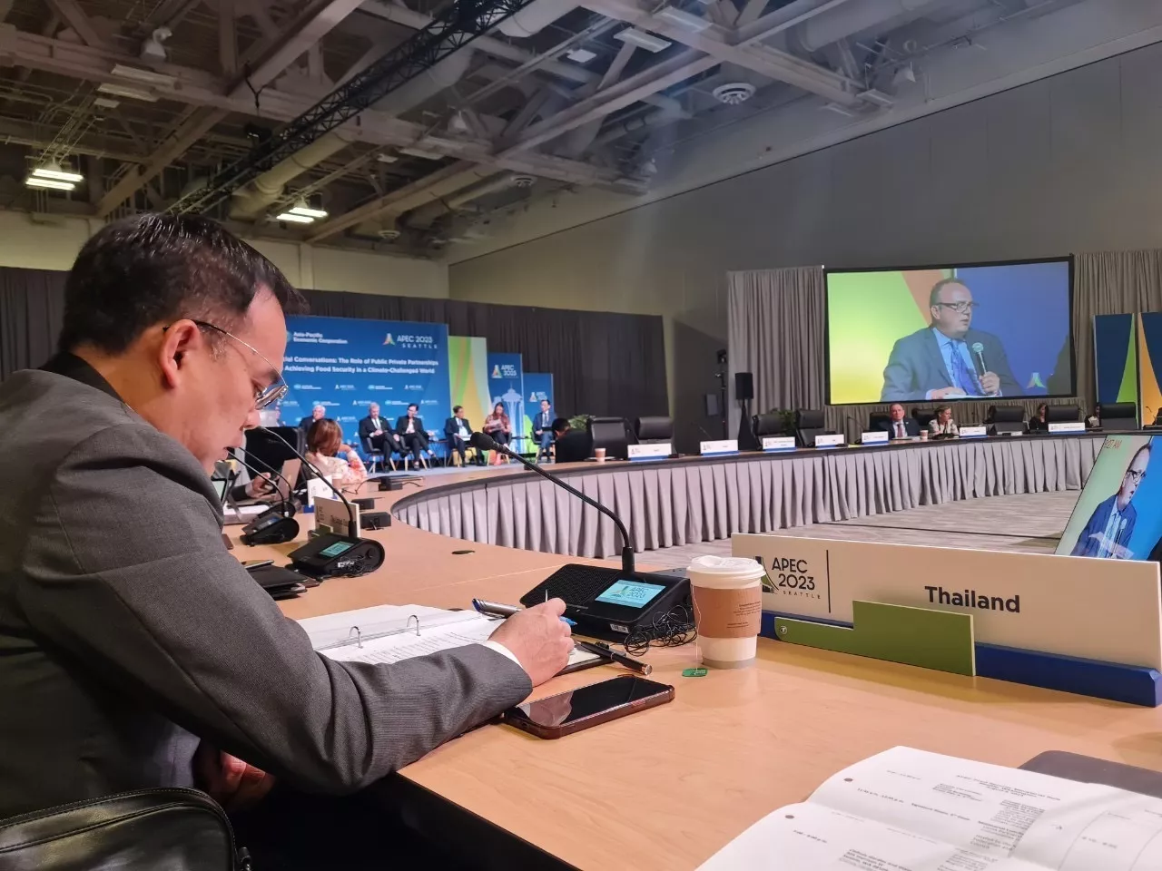 นอกจากนี้ เลขาธิการ สศก. ยังได้ถูกเชิญให้เป็น Speaker นำเสนอนโยบายด้านเกษตรที่มุ่งเน้นรับมือของภาคเกษตรกับการเปลี่ยนแปลงสภาพภูมิอากาศ การสร้างความมั่นคงอาหาร และการส่งเสริมการค้าสินค้าอาหาร โดยเน้นแนวทาง 3 แนวทาง เพื่อรับมือ กับการเปลี่ยนแปลงสภาพภูมิอากาศ ได้แก่ การลดและป้องกัน การปรับตัว และการใช้เทคโนโลยี เช่น การปลูกป่า การลดการเผา การทำนาแบบเปียกสลับแห้ง การลดการใช้สารเคมี การใช้เมล็ดพันธุ์ที่ทนแล้งและน้ำท่วม การเลี้ยงปลาในนาข้าว แก้มลิงพยากรณ์ผลผลิต การจัดทำระบบเตือนภัย เป็นต้น