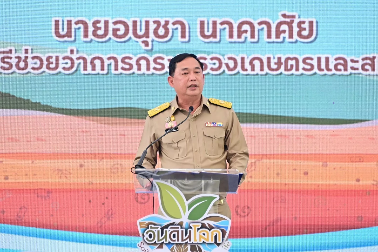 วันที่5 ธันวาคม 2566 ร้อยเอก ธรรมนัส พรหมเผ่า รัฐมนตรีว่าการกระทรวงเกษตรและสหกรณ์ มอบหมายนายอนุชา นาคาศัย รัฐมนตรีช่วยว่าการกระทรวงเกษตรและสหกรณ์ เป็นประธานในพิธีมอบรางวัลในงานวันดินโลกในปี 2566 ภายใต้หัวข้อ“Soil and Water : a source of life ดินดี น้ำสมบูรณ์เกื้อกูลชีวิต”ซึ่งกระทรวงเกษตรและสหกรณ์ กรมพัฒนาที่ดิน และองค์การอาหารและเกษตรแห่งสหประชาชาติ หรือ FAO ร่วมกับหน่วยงานภาคีเครือข่าย ร่วมกันจัดขึ้นระหว่างวันที่ 5-10 ธันวาคม 2566 ณ ศูนย์ศึกษาการพัฒนาเขาหินซ้อน อันเนื่องมาจากพระราชดำริ จ.ฉะเชิงเทรา เพื่อเทิดพระเกียรติพระบาทสมเด็จพระบรมชนกาธิเบศร มหาภูมิพลอดุลยเดชมหาราช บรมนาถบพิตร“นักวิทยาศาสตร์ดินเพื่อมนุษยธรรม” (Humanitarian Soil Scientist Award) พระองค์แรกและพระองค์เดียวของโลก และส่งเสริมให้ประชาชนตระหนักรู้คุณค่าและความสำคัญของทรัพยากรดินในภาคการเกษตร