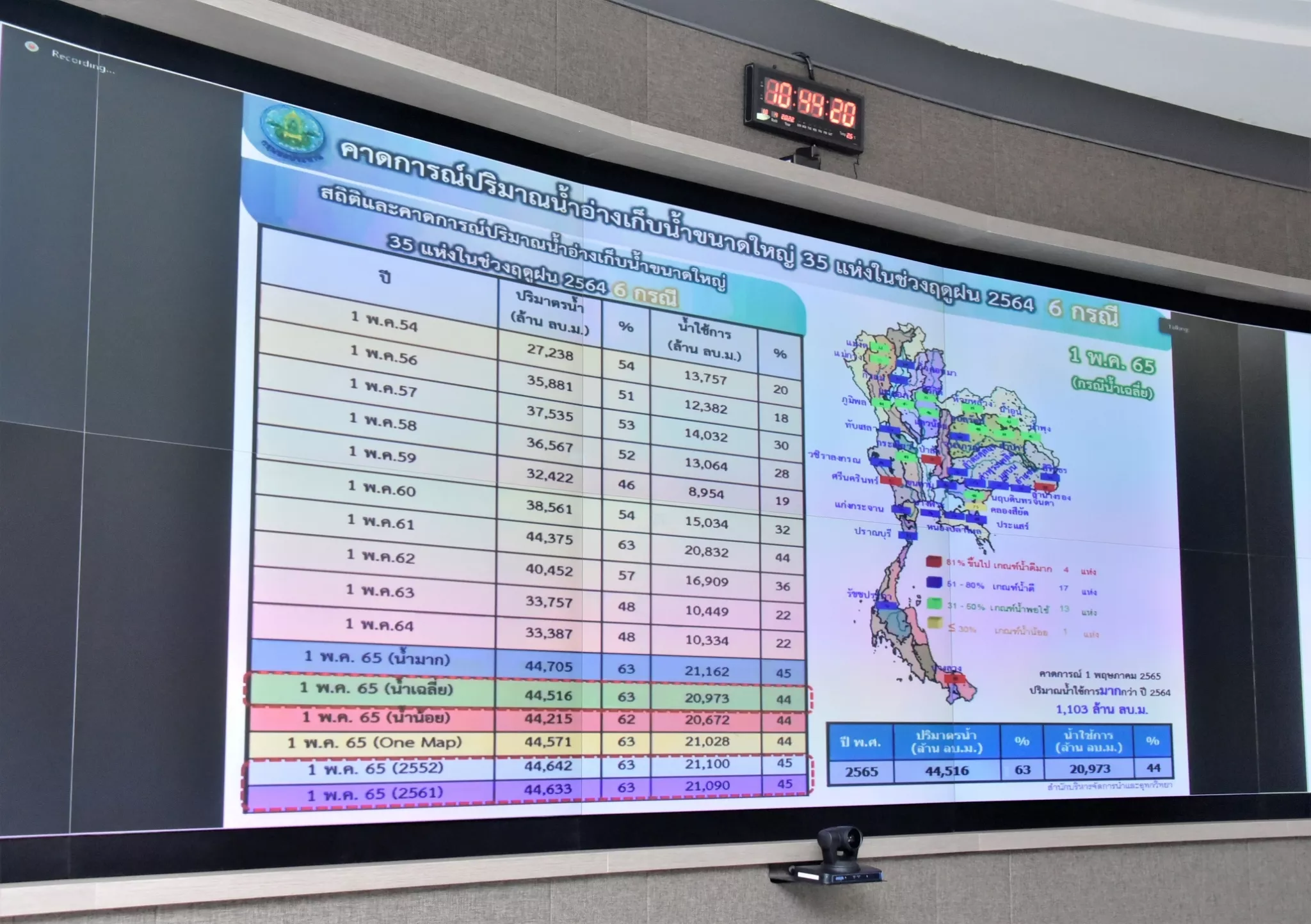 นายประพิศ จันทร์มา อธิบดีกรมชลประทาน เปิดเผยว่า ปัจจุบัน (21 เม.ย.65) อ่างเก็บน้ำขนาดใหญ่และขนาดกลางทั่วประเทศ มีปริมาณน้ำรวมกันทั้งสิ้น 44,964 ล้าน ลบ.ม. คิดเป็นร้อยละ 59 ของความจุอ่างฯ รวมกัน) เป็นน้ำใช้การได้ 21,026 ล้าน ลบ.ม. ได้มีการจัดสรรน้ำทั้งประเทศไปแล้ว จัดสรรน้ำไปแล้ว 21,614 ล้าน ลบ.ม. หรือร้อยละ 97 ของแผนฯ เฉพาะ 4 เขื่อนหลักลุ่มน้ำเจ้าพระยา (เขื่อนภูมิพล เขื่อนสิริกิติ์ เขื่อนแควน้อยบำรุงแดน และเขื่อนป่าสักชลสิทธิ์) มีปริมาณน้ำรวมกันทั้งสิ้น 10,516 ล้าน ลบ.ม. หรือคิดเป็นร้อยละ 42 ของความจุอ่างฯ รวมกัน ปริมาณน้ำใช้การได้ 3,820 ล้าน ลบ.ม. และมีการจัดสรรน้ำไปแล้ว 5,969 ล้าน ลบ.ม. หรือร้อยละ 105 ของแผนฯ ภาพรวมสถานการณ์น้ำอยู่ในเกณฑ์ปกติ