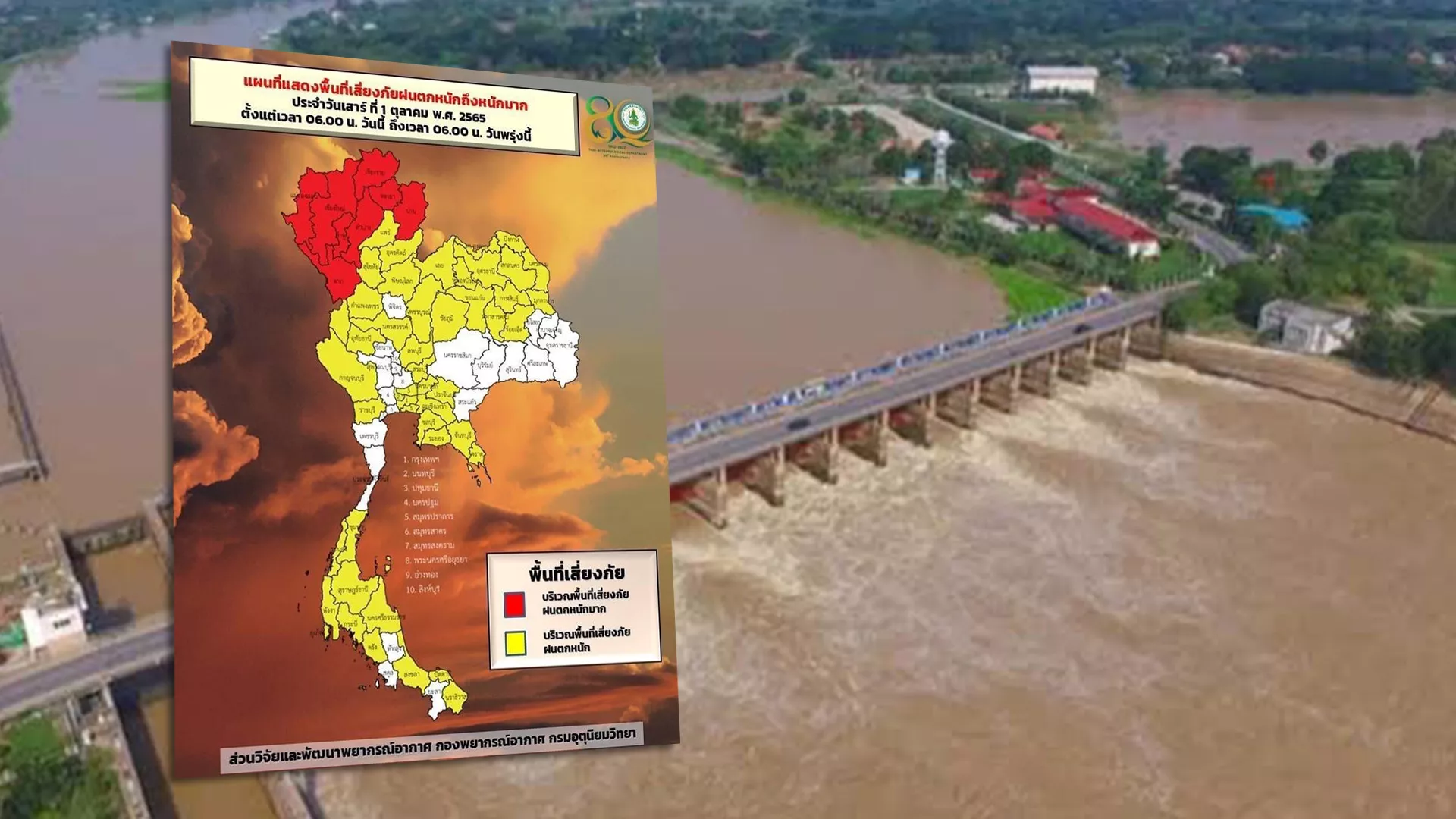ขณะที่ลักษณะอากาศทั่วไป พยากรณ์อากาศ 24 ชั่วโมงข้างหน้าวันนี้(1 ตุลาคม 2565) ร่องมรสุมพาดผ่านภาคเหนือและภาคตะวันออกเฉียงเหนือตอนบน ประกอบกับมีหย่อมความกดอากาศต่ำปกคลุมภาคเหนือด้านตะวันตก ในขณะที่มรสุมตะวันตกเฉียงใต้กำลังค่อนข้างแรงยังคงพัดปกคลุมทะเลอันดามัน ภาคใต้ และอ่าวไทย ลักษณะเช่นนี้ทำให้ประเทศไทยมีฝนตกต่อเนื่องและมีฝนตกหนักถึงหนักมากบางแห่งในภาคเหนือ ภาคตะวันออกเฉียงเหนือ ภาคกลาง รวมทั้งกรุงเทพมหานครและปริมณฑล ภาคตะวันออก และภาคใต้ ขอให้ประชาชนในบริเวณดังกล่าวระวังอันตรายจากฝนตกหนักถึงหนักมากและฝนที่ตกสะสมซึ่งอาจทำให้เกิดน้ำท่วมฉับพลันและน้ำป่าไหลหลาก โดยเฉพาะพื้นที่ลาดเชิงเขาใกล้ทางน้ำไหลผ่านและพื้นที่ลุ่มในระยะนี้ไว้ด้วย
