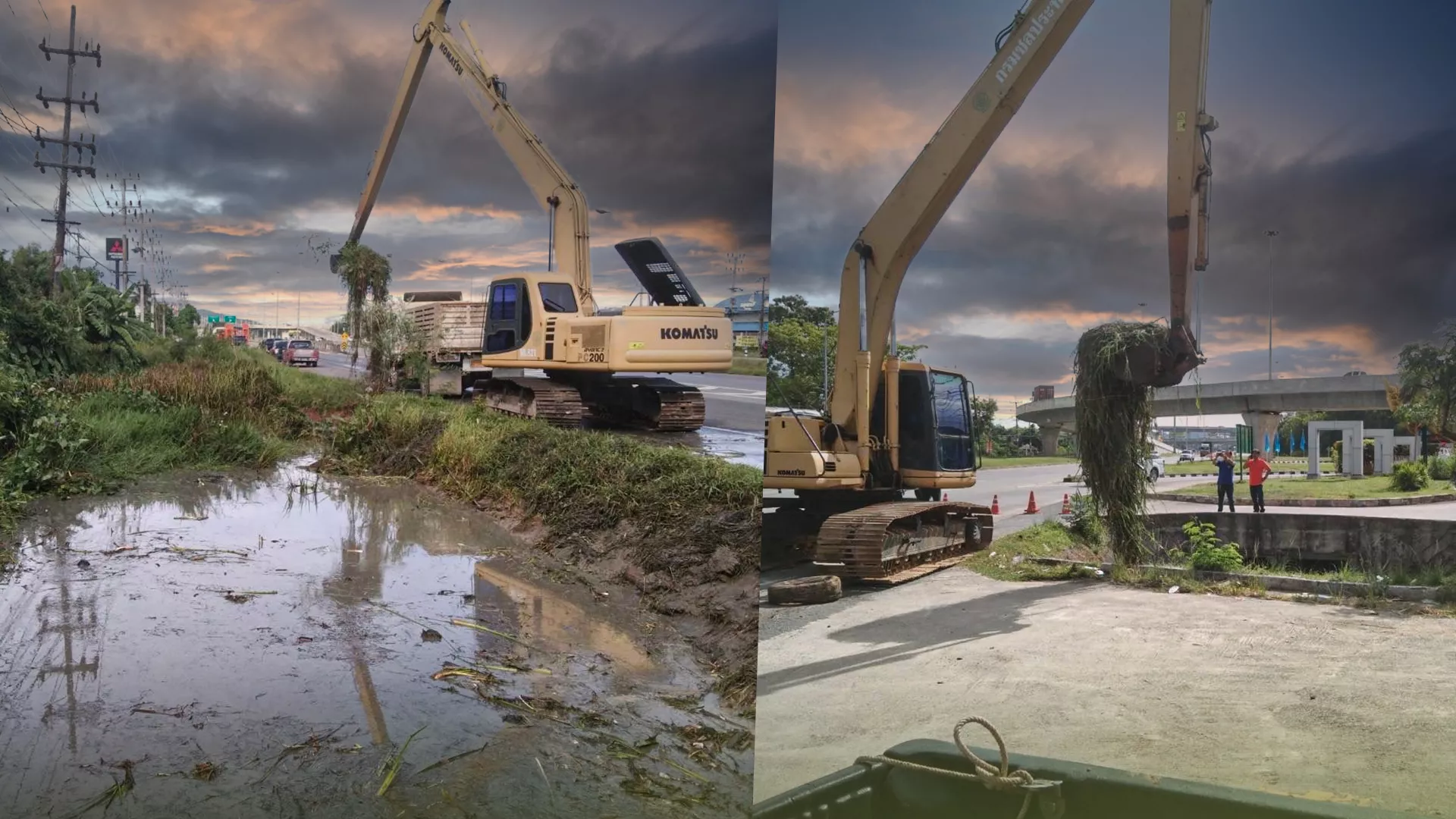 -บริเวณริมถนนลพบุรีราเมศวร์ ตำบลพะวง อำเภอเมือง จังหวัดสงขลา นำรถแบคโฮขุดลอกคูคลอง และกำจัดวัชพืชสิ่งกีดขวางทางน้ำ