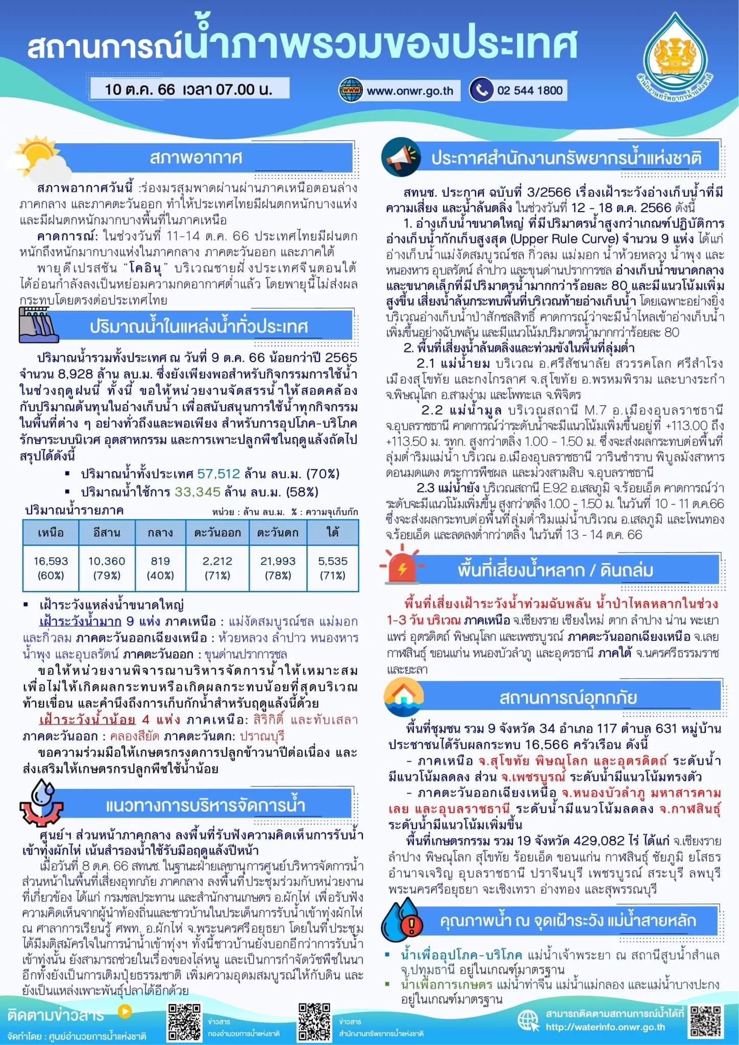 สำนักงานทรัพยากรน้ำแห่งชาติ (สทนช. )สรุปสถานการณ์น้ำภาพรวมของประเทศ วันที่ 10 ต.ค. 66