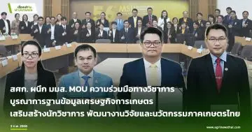 สศก. ผนึก มมส. MOU ความร่วมมือทางวิชาการ บูรณาการฐานข้อมูลเศรษฐกิจการเกษตร เสริมสร้างนักวิชาการ พัฒนางานวิจัยและนวัตกรรมภาคเกษตรไทย