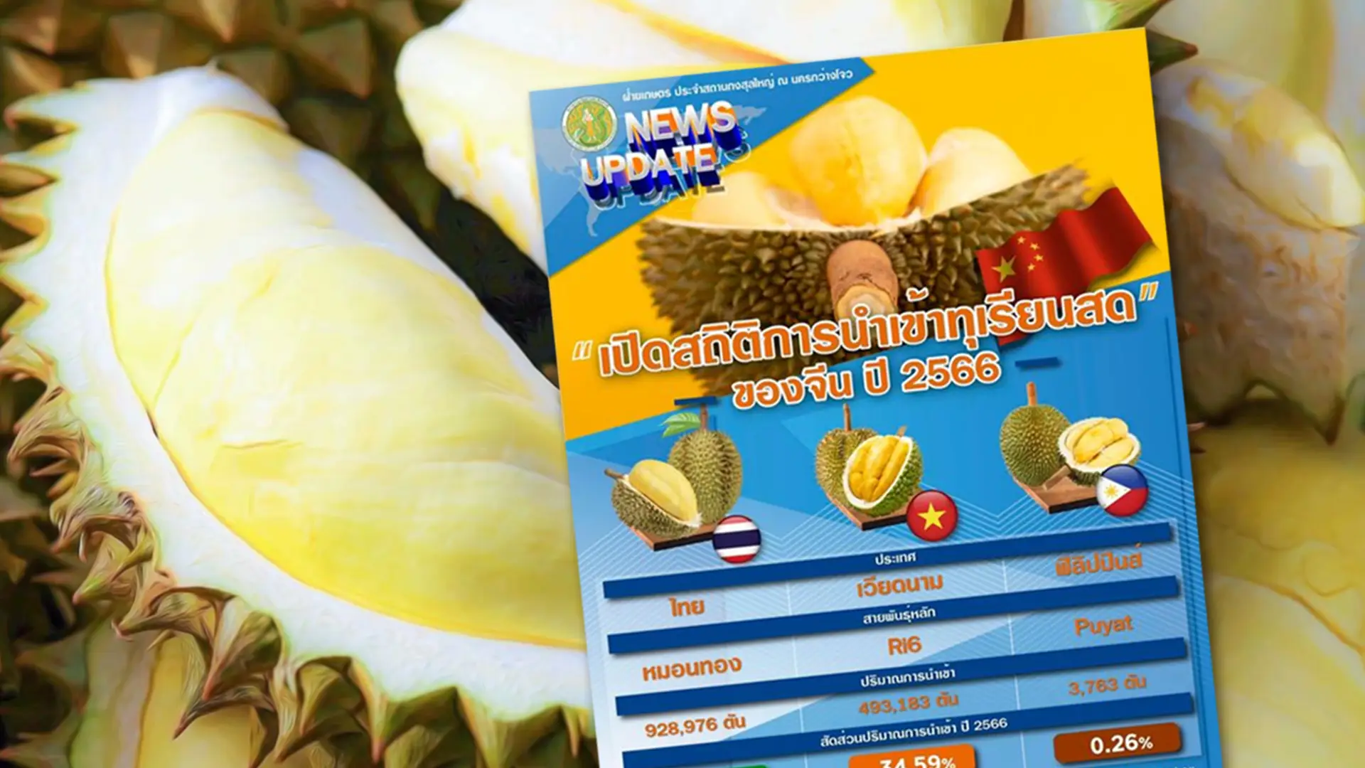 จากรายงานสถานการณ์การค้าสินค้าเกษตร ประจำเดือนพฤศจิกายน 66 ของสำนักงานที่ปรึกษาการเกษตรต่างประเทศของไทยประจำกรุงปักกิ่ง จีนนำเข้าทุเรียนจากเวียดนามเป็นอันดับหนึ่ง ไทยอันดับสองเช่นเดียวกับผลไม้ ๆ อื่น